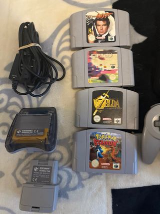 Consola Nintendo 64 con diseño temático de The Legend of Zelda. - Incluye dos mandos grises (Joysticks para reemplazar) - Incluye varios juegos: The Legend of Zelda: Ocarina of Time, Pokémon Stadium, FIFA 99, GoldenEye 007. - Incluye accesorios: Rumble Pak, Transfer Pak y cable de antena. No incluye fuente de alimentacion