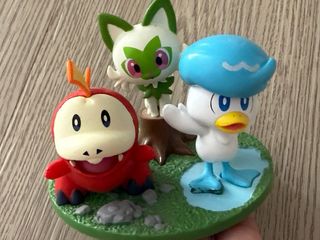 Set de figuras de los Pokémon iniciales de la región de Paldea. - Incluye a Sprigatito, Fuecoco y Quaxly. - Base decorada con elementos naturales con pequeño defecto