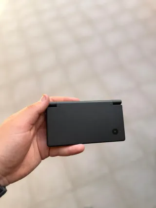 Consola portátil Nintendo DSi en color negro. - Pantalla superior e inferior. - Botones de control direccional y de acción. - Botón de encendido.