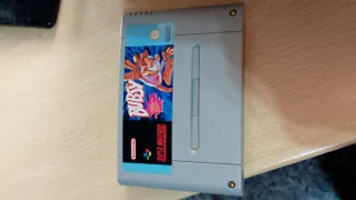 Cartucho del videojuego Bubsy para Super Nintendo. - Juego de plataformas. - Cartucho gris. - Etiqueta con arte del personaje Bubsy.