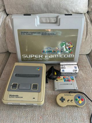 Nintendo Super Famicom Con 1 mando Algo amarilla del tiempo, solo estetico. Tiene modificación para jugar juegos PAL. Ver foto 8 y 9 corriendo juego PAL. No se incluye, es para que se vea que es funcional. Solo se incluye juego japones. Incluyo: Consola 1 Mando Cable de Video Juego Maletin Adaptador de corriente 110v. La consola es una versión japonesa obligado un transformador de 110v a 220v. Por 10€ mas puedo entregarla a domicilio en Barcelona Por 15€ mas, doy el transformador de 110v a 220v (Ultima foto) Puedo enviar mas fotos o videos por whatsapp si es necesario. La foto con el maletin lleno (6) no se incluyen juegos.