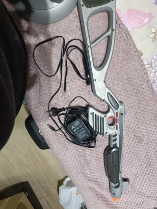 Pistola de videojuego en color gris, ideal para juegos de disparos. - Diseño ergonómico. - Incluye cargador y cable de alimentación.