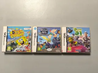 Juegos en perfecto estado. Funcionan perfectamente. Bob Esponja Botes de choque con manual, caka y cartucho. Planeta 51 con manual, caka y cartucho. Phineas y Ferb 2 dimension solo caja y cartucho. Todos sin precinto.