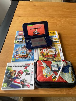 Consola Nintendo 3DS XL en color azul, con varios juegos. - Consola Nintendo 3DS XL - Juego: Mario Kart 7 - Juego: Yo-kai Watch 2 - Juego: Yo-kai Watch: Carnanimas - Juego: LEGO City - Juego: Brain Training - Funda de transporte Pokémon Pantalla un poco desgastada por los bordes