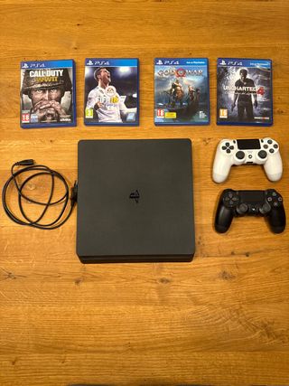 Consola PlayStation 4 Slim en color negro con disco duro de 1TB. - Incluye 4 videojuegos: Call of Duty: WWII, FIFA 18, God of War y Uncharted 4. - Incluye mando DualShock 4 blanco. - Incluye mando DualShock 4 negro. - Incluye cables de conexión.
