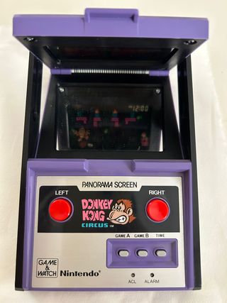 Consola portátil clásica Nintendo Game & Watch. - Modelo Donkey Kong Circus. - Pantalla Panorama Screen. - Diseño en color púrpura y plateado. En perfecto estado, funciona correctamtente Muy dificil de encontrar