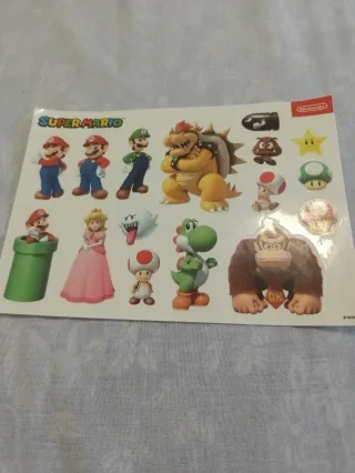 Set de pegatinas de Super Mario. - Incluye personajes icónicos como Mario, Luigi, Peach, Yoshi, Bowser y Donkey Kong. - También vienen figuras de Boo, Toad, una seta, una estrella y una bala. - Ideal para decorar objetos personales.