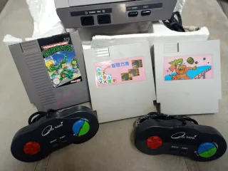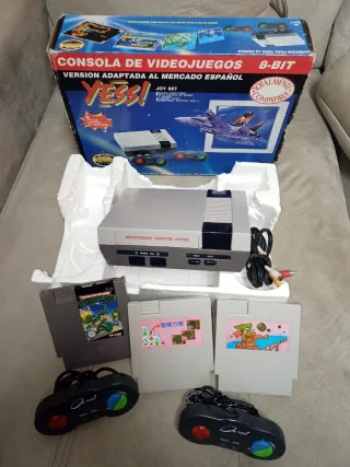 Consola de videojuegos Yess 8-Bit, versión adaptada al mercado español. Incluye dos mandos y tres cartuchos de juegos. - Consola gris. - Dos mandos negros. - Tres cartuchos de juegos: Teenage Mutant Ninja Turtles original de nes , Taito y Donkey Kong junior. - Cables Av incluido. Con Salida Jack para auriculares No incluye cable de alimentación