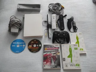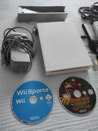 Consola Nintendo Wii en color blanco, compatible con juegos de GameCube. Incluye varios accesorios y títulos. - Consola Wii - Base para la consola - 2 Mando Wii Remote, uno negro con wiimotion - Nunchuk negro - Mando Wii Classic Pro Controller - Cable de vídeo y alimentación - Barra sensor - Juego Wii Sports (disco) - Juego Donkey Kong Country Returns (disco) - Juego Ferrari Challenge (caja) - Juego Wii Fit (caja) Revisar las fotos y consultar las dudas