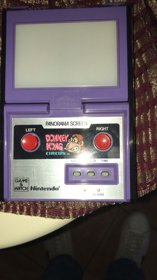 Consola portátil clásica Nintendo Game & Watch. - Modelo: Donkey Kong Circus. - Pantalla panorámica. - Diseño en color púrpura y plateado.