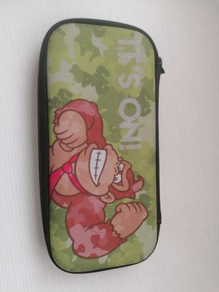 Estuche rígido para Nintendo Switch con diseño de Donkey Kong. Está en buen estado. - Diseño de camuflaje verde. - Imagen de Donkey Kong. - Texto "It's On!".