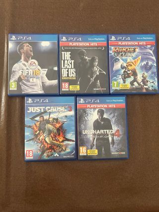 Conjunto de cinco videojuegos para PlayStation 4. - FIFA 18 - The Last of Us Remasterizado - Ratchet & Clank - Just Cause 3 - Uncharted 4: El Desenlace del Ladrón