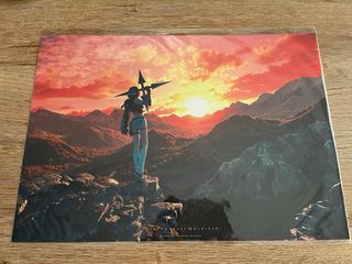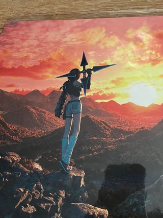 Póster de Yuffie del videojuego Final Fantasy 7 Rebirth. La imagen muestra a Yuffie con su arma característica en un paisaje montañoso al atardecer. - Producto oficial de Square Enix - 36.5 x 25.5 cm