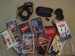 Consola portátil PSP negra con cargador y 10 juegos. - Grand Theft Auto: Vice City Stories - Grand Theft Auto: Liberty City Stories - Pro Evolution Soccer 5 - FIFA 10 - Kung Fu Sión - Gangs of London - ATV Offroad Fury Pro - Copa Mundial de la FIFA Sudáfrica 2010 - Spongebob: The Movie Game - Un juego sin título visible