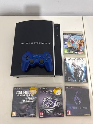 Se vende consola PlayStation 3 en color negro, junto con un mando azul y cuatro videojuegos. - Consola PlayStation 3 - Mando DualShock 3 azul - Grand Theft Auto V (no tiene caja) - Assassin's Creed - Call of Duty: Ghosts - Saints Row: The Third - Resident Evil 6