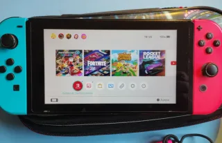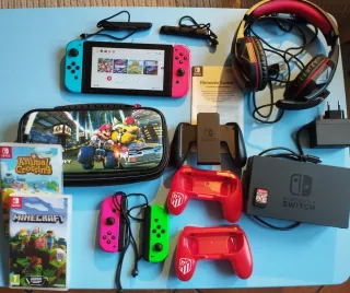Consola Nintendo Switch con accesorios, completísima!!! - Incluye funda de transporte edición limitada de Mario Kart con soporte para jugar y cartucheras para 9 juegos y juego Mario kart incluido - 2 pares de joy-con controler originales. -soporte de carga joy original - Dos pares de grips para Joy-Con. - Auriculares gamer - 2 carcasas para mandos atlético de Madrid oficial. -micro sd 128 gb - conector de corriente yBase de carga y conexión a tv - Juegos: Animal Crossing y Minecraft. - precio no negociable todo está como nuevo y todo es original excepto los auriculares!!!!!