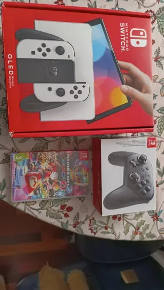 Pack de Nintendo Switch OLED en muy buen estado. El pack incluye: - Consola switch oled color blanco con todos sus accesorios y protector de pantalla instalado - Tarjeta sd de 256gb - Funda para la protección de la consola temática Zelda - Funda de transporte temática one piece - Mando Nintendo switch Pro - Mario kart 8 Deluxe - Cajas en muy buen estado