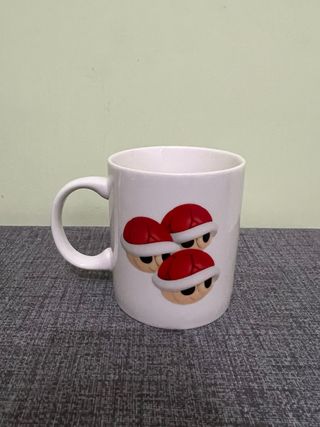 Taza blanca con diseño de Mario Kart. - Ilustración de tres caparazones rojos. - Ideal para fans de los videojuegos. -Nueva, nunca se ha utilizado