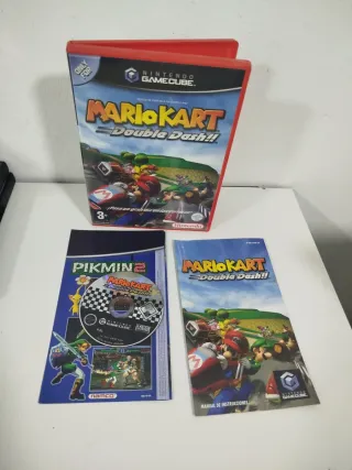 Juego de carreras Mario Kart: Double Dash!! para Nintendo GameCube. Incluye la caja original, el manual de instrucciones y el disco del juego. - pal España - completo - Caja original con diseño de Mario Kart: Double Dash!! - Manual de instrucciones en español. - Disco del juego Mario Kart: Double Dash!! - Incluye también un folleto de Pikmin 2.