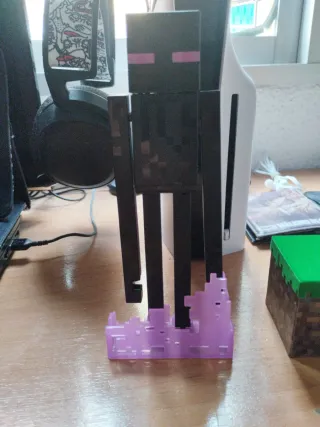 Figura coleccionable del Enderman de Minecraft. Ideal para los fans del juego. - Diseño inspirado en el personaje del videojuego. - Base de soporte con efecto pixelado morado.
