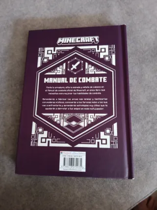 Manual de combate de Minecraft, edición actualizada. - Portada morada con diseño pixelado dorado. - Incluye el logo de Mojang Studios. - Publicado por HarperCollins.