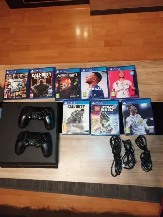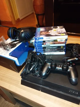 Consola PlayStation 4 en color negro, lista para disfrutar. - Incluye dos mandos DualShock 4. - Auriculares nuevos para una experiencia de audio inmersiva. - Ocho videojuegos que se ven en las imagenes: •GTA •FIFA 18 •FIFA 20 •FIFA 22 •LEGO STAR WARS •CALL OF DUTY ADVANCED WARFARE •MINECRAFT •CALL OF DUTY BLACK OPS 3. - Todos los cables necesarios para su conexión. La vendo porque me compré la 5. ⚠️Se entrega completamente limpia, tanto la play, como los cascos y mandos⚠️