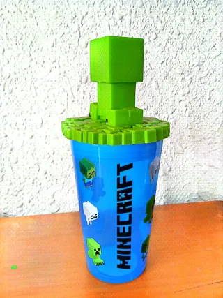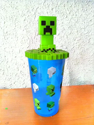 Vaso azul con temática de Minecraft, ideal para fans del juego. Presenta un diseño divertido con varios personajes 🔥 - Tapa verde con figura de Creeper 😉 - Decorado con personajes de Minecraft como zombies y fantasmas 😏 - Vaso exclusivo 😈 - No incluye la pajita por higiene.