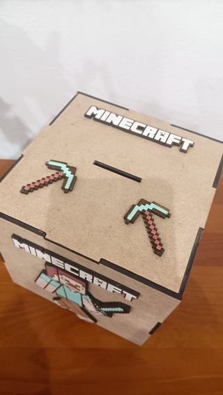Te traigo una hucha de minecraft totalmente de madera .