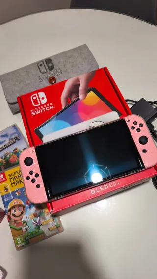 Consola Nintendo Switch OLED en color rosa, con accesorios y juegos. - Incluye funda de transporte. - Incluye dos juegos: Minecraft y Super Mario Maker 2. - Incluye Joy-Cons rosas. - Incluye cargador.