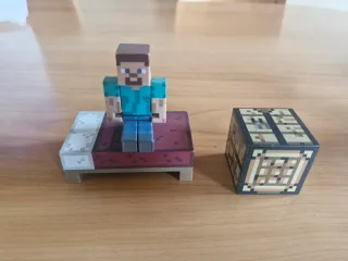 Set de figuras de Minecraft con Steve, un cofre y una mesa de crafteo. - Figura de Steve sentado en una cama. - Cofre abierto. - Mesa de crafteo.