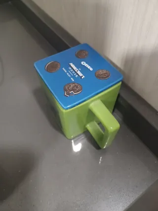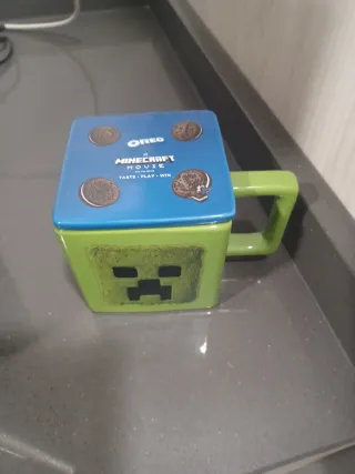 Taza con diseño de Minecraft y Oreo. - Tapa azul con detalles de galletas Oreo. - Color verde de la taza.