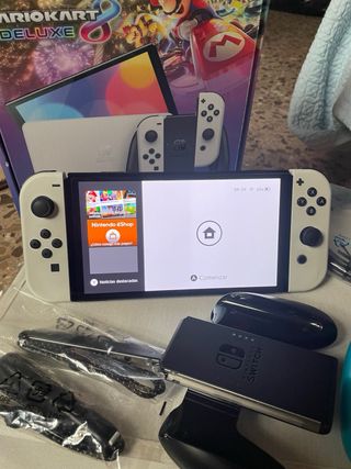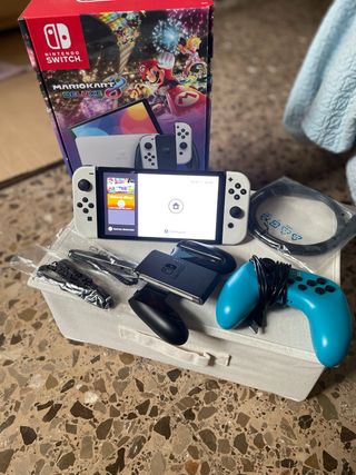Consola Nintendo Switch OLED en color blanco, lista para horas de diversión. Incluye 3 videojuegos originales y muchos más en su memoria interna. - Sonic Superstars - Minecraft - Hot wells,unleashed 2 turbochargerd. Más mochila mariobros de neopreno anti, agua. Más un mando extra y dos volantes , más caja para guardar juegos, con todos sus cables de conexión más hdmi, tiene 8 meses y apenas se a jugado, está nueva impoluta con su caja, le regalaron la play station 5 y mi niño la dejo de lado , por eso la vendemos, .lo vendo todo en 295 euros