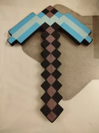 Réplica del pico de diamante de Minecraft, ideal para coleccionistas o fans del juego. Tiene un diseño pixelado característico. - Colores: azul claro, gris y negro. - Material: madera.