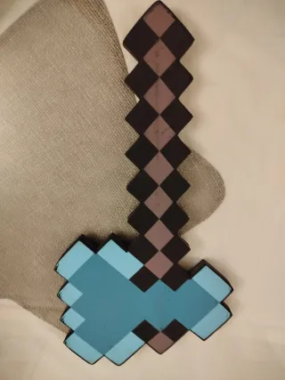 Réplica de la espada de Minecraft, inspirada en el diseño de diamante. Perfecta para coleccionistas o para cosplay. - Diseño pixelado característico. - Colores azul y negro con detalles en gris.