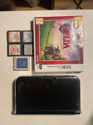 Consola Nintendo 3DS XL en color negro, lleva una funda protectora. Tiene algunas marcas de uso como rayadas superficiales pero nada notable. Aparte esta en excelente condicion. - Juego: The Legend of Zelda: Ocarina of Time 3D - Juegos variados (muchos incluidos, desde pokemon oro a spiderman)