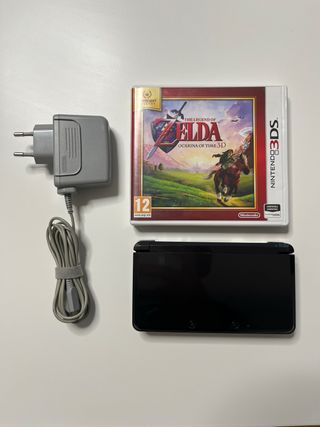 Consola Nintendo 3DS en color negro, junto con el juego The Legend of Zelda: Ocarina of Time 3D. Incluye cargador oficial y una tarjeta SD. No incluye lápiz táctil. - Juego: The Legend of Zelda: Ocarina of Time 3D. - Consola: Nintendo 3DS. - Color: Negro. - Accesorios: Cargador y tarjeta SD.