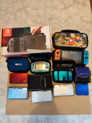 Consolas Nintendo : 3 Nintendo DS fat 2 plateadas y una azul 1 Nintendo switch con su caja y todos los accesorios y cables 1 Game boy sp azul 1 Nintendo 3ds azul 1 Nintendo 3ds roja 1 Game boy advance con pantalla retroiluminada y batería que se carga por tipo c ( ahí que cambiar la batería) 1 funda original Game boy advance 2 fundas nintendo switch 3 fundas compatibles con advance o DS Envío y pagos externos a app o en mano
