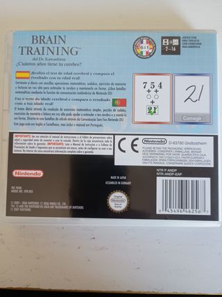 Juego de entrenamiento cerebral para Nintendo DS. Más Brain Training engloba una serie de ejercicios de distinta dinámica, desde ejercicios de cálculo y retención de datos hasta ejercicios de lectura y ortografía, todo ello con el fin de ejercitar la mente. - Título: Más Brain Training del Dr. Kawashima. - Plataforma: Nintendo DS. - Género: Educativo. - Clasificación PEGI: 3+.