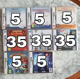 Vendo siete juegos de Nintendo DS en buen estado. - Incluyen: More Brain Training, Practise English, English Training, Combat of Giants: Dragons, WALLE, One Piece Giant Battle y Pokémon Edición Diamante. - Incluyen los 2 manuales de las fotos - Los juegos no están en sus cajas originales.