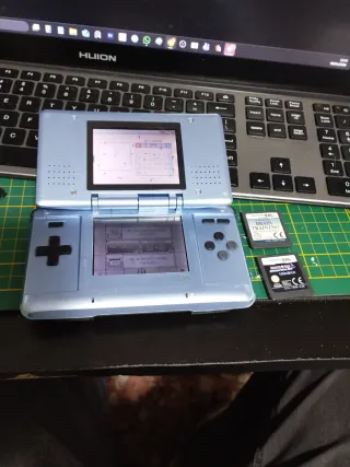 Consola portátil Nintendo DS en color azul. IMPORTANTE!!! Tiene píxeles muertos en las dos pantallas, pero funcionan perfectamente. No sé incluye cargador, pero en AliExpress los venden por 1,50€ - Incluye dos juegos: Brain Training y Monster high. - Pantalla superior e inferior. - Botones de control direccional y botones de acción.
