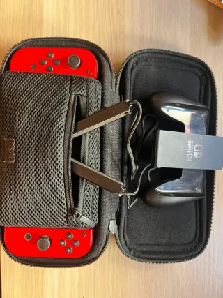 Consola Nintendo Switch con accesorios. PRECIO NEGOCIABLE.✅ - Incluye dos Joy-Cons de color rojo.✅ - Estuche de transporte de mario Odyssey un poco desgastada - Empuñadura para Joy-Cons.✅ -sin cargador pero se puede cargar con cualquier cargador tipo C. -le falta la palanquita de atras para apoyarlo. -con juego de mario rabits y mando incluido.🦸