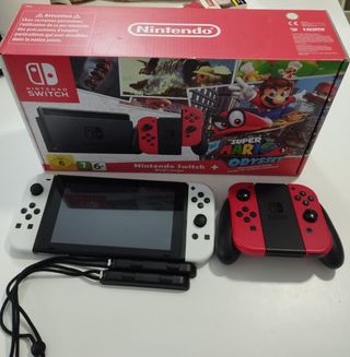 Nintendo Switch en excelentes condiciones, con un diseño en dos tonos, rojo y blanco. Incluye la consola, dos controles Joy-Con rojos y blancos, y un código de descarga para Super Mario Odyssey. - Consola Nintendo Switch en perfecto estado. - Dos controles Joy-Con. - Código de descarga de Super Mario Odyssey.