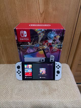 Consola Nintendo Switch modelo OLED en color blanco, junto con el videojuego Super Smash Bros Ultimate. - Incluye consola, Joy-Cons y base de carga. - Videojuego Super Smash Bros Ultimate. Todo incluido