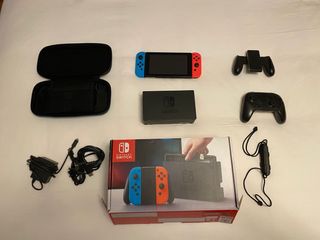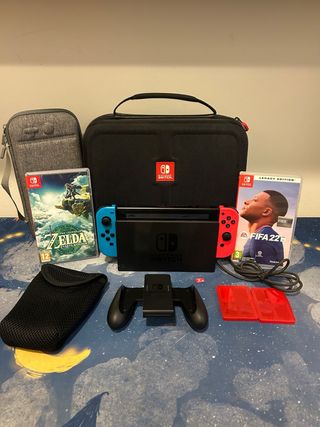 Nintendo Switch con todo lo que se ve en la foto: - The Legend of Zelda: Breath of the Wild y FiFa Legacy Edition. - Tarjeta de memoria Nintendo 128 GB - Funda de transporte rígida Nintendo. - Funda de transporte blanda gris. - Agarre para mandos. - Cargador y cables originales.