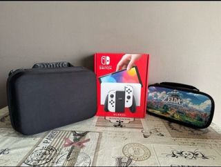 Consola Nintendo Switch OLED en color blanco, junto con accesorios para su transporte y protección. - Funda de transporte negra. - Funda de transporte temática de Zelda: Link's Awakening. - Caja original de la consola. - Cable de alimentación original - Cable HDMI En perfecto estado y funcionamiento. Se entrega formateada de fábrica.