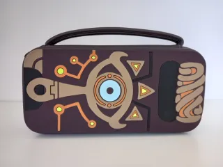Funda protectora para Nintendo Switch con un diseño inspirado en el Ojo de Sheikah de The Legend of Zelda. - Color marrón oscuro. - Cierre de cremallera. - Asa de transporte superior.