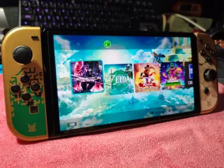 Consola Nintendo Switch OLED con un diseño especial inspirado en The Legend of Zelda: Tears of the Kingdom. "Mantenimiento" 🪄recién hecho." - En perfectas condiciones. - Joy-Con dorados y verdes con detalles grabados. - Como nueva. - Todos los accesorios originales excepto los carriles de los joycon. - Tarjeta de 128Gb