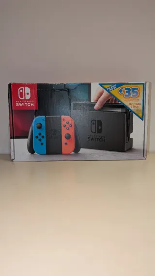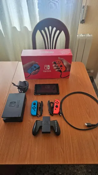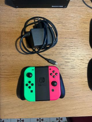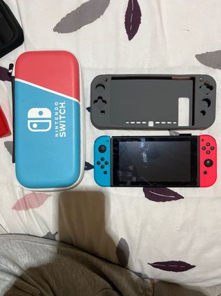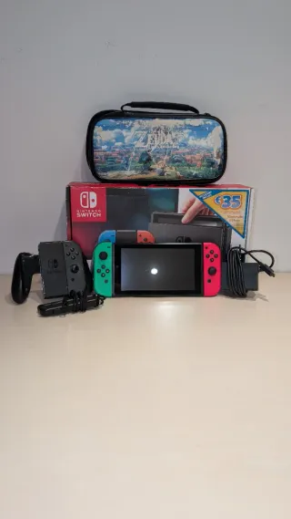 Se vende esta Nintendo Switch V1 con accesorios incluidos. Ideal para jugar en cualquier lugar. Funciona perfectamente y la consola solo tiene pequeñas marcas de uso por la parte de detrás. Viene incluido todo lo siguiente (se puede ver en las fotos): - Nintendo Switch (consola) - Joy-Cons de color verde (va un poco duro hacia la izquierda y el botón L3 funciona però al rato deja de funcionar) y rojo (+ Joy-Con gris extra de regalo) - Estuche de transporte con diseño de Zelda: Link's Awakening. - Caja original - Cargador original - Correas de muñeca - Cargador para los Joy-Con Cualquier duda sobre el producto o sobre el precio no