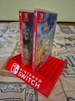 Dos soportes temáticos para Nintendo Switch y The Legend of Zelda. - Soporte negro con el logo de Zelda. - Soporte rojo con el logo de Nintendo Switch.