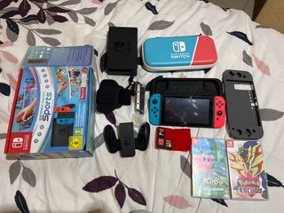 Consola Nintendo Switch con accesorios y juegos. - Incluye consola, Joy-Cons, base de carga, funda de transporte y protector. - Juegos incluidos: Nintendo Switch Sports, Kirby, Zelda breath or the Wild, Pokémon Escudo, pokemon escarlata, Saga grand theft auto - Funda de transporte con espacio para cartuchos.